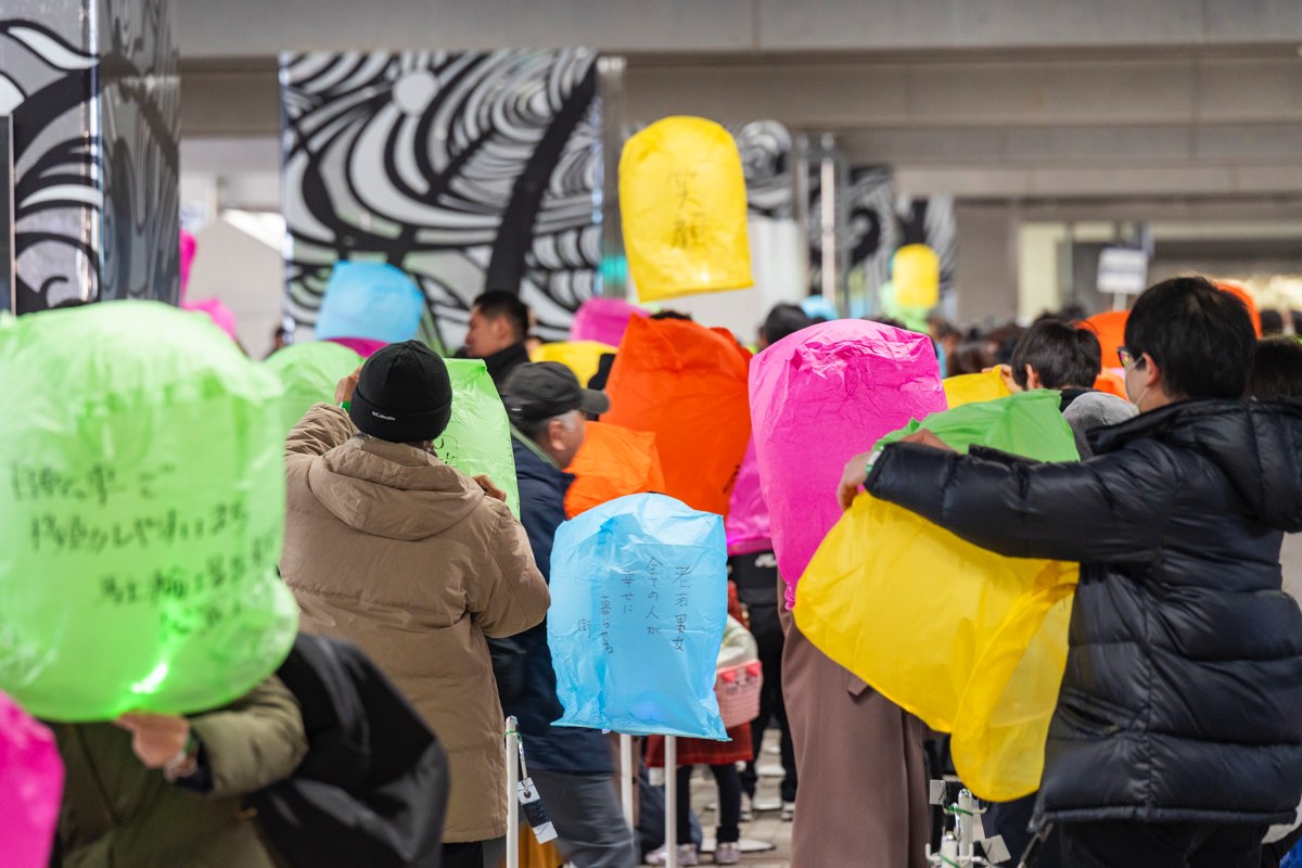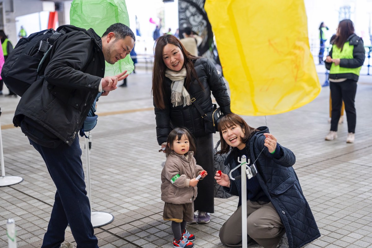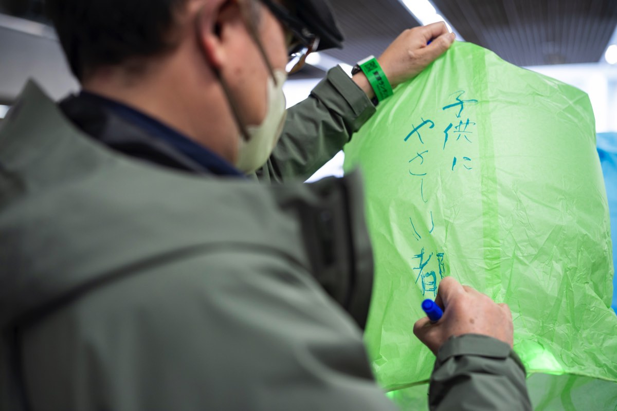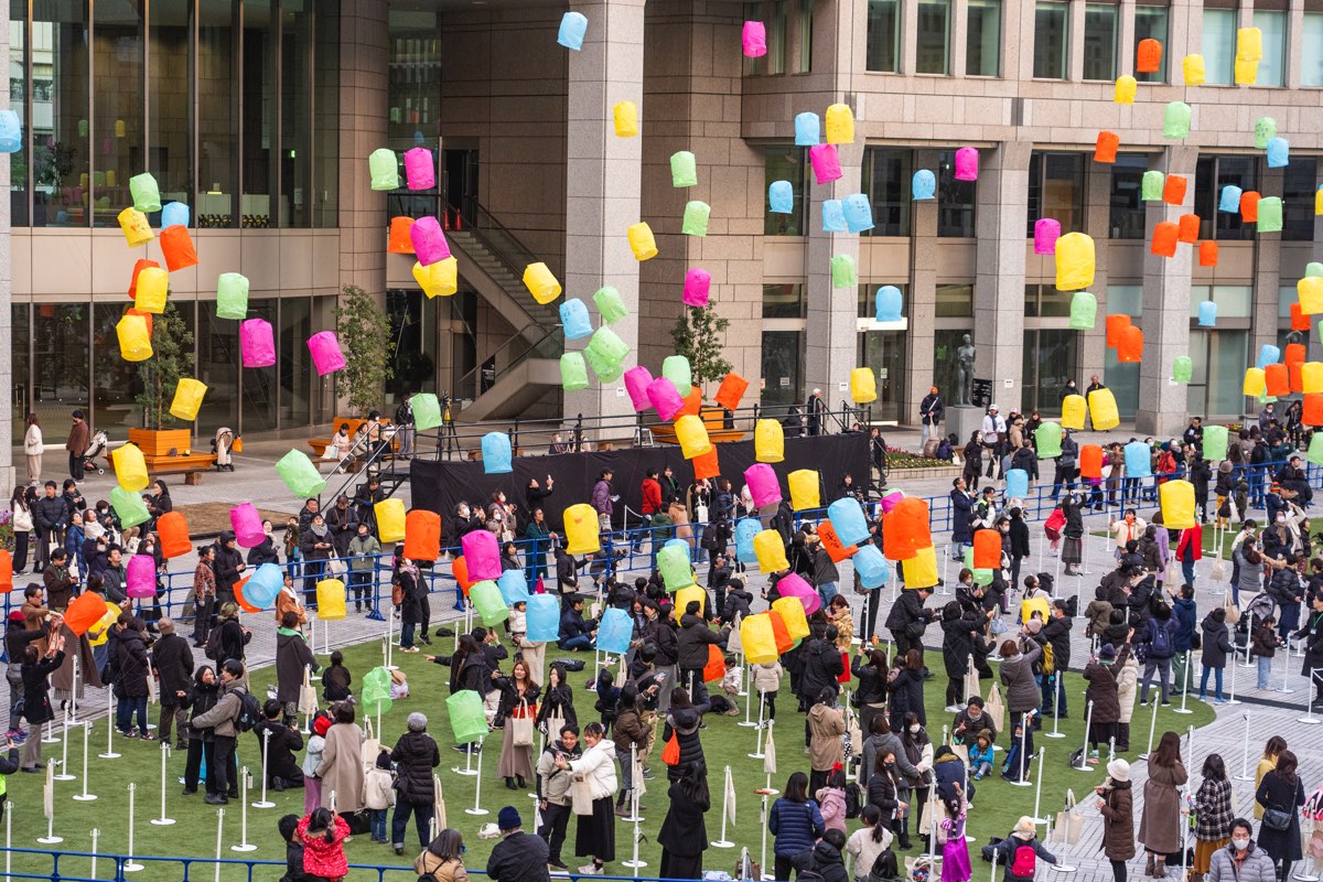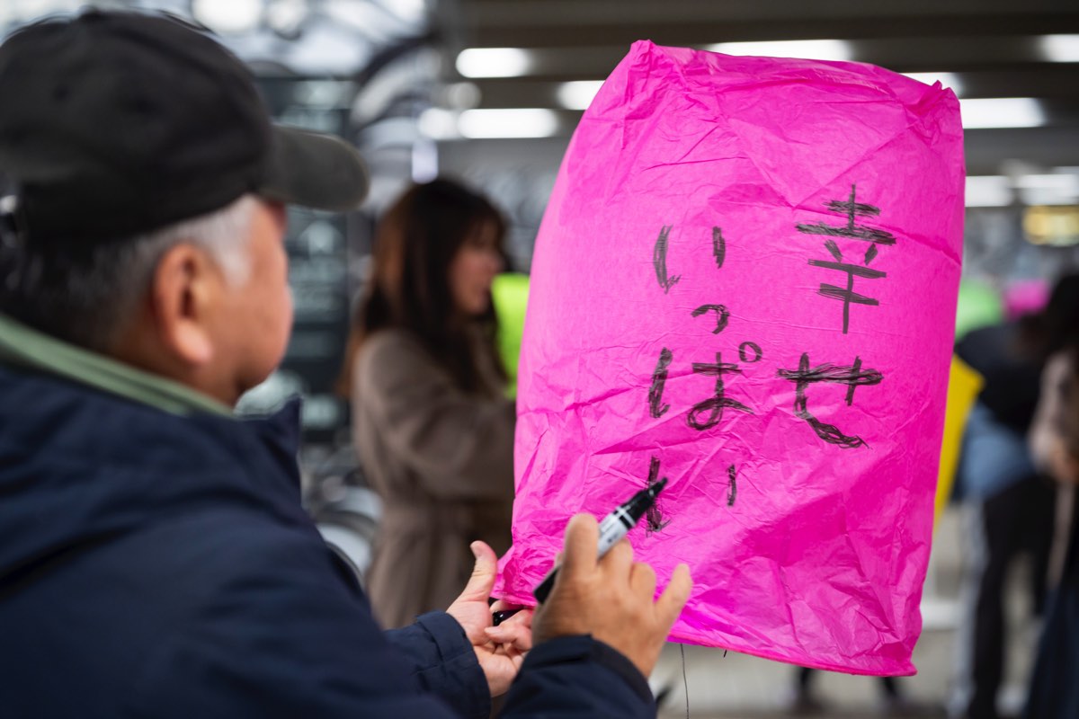 冷たい空気の中にも少しずつ春を感じる、2月15日の夕方。会場となる東京都庁 都民広場に設置されたブースが、メッセージを書き込む参加者でにぎわい始めました。用意されたのは、色とりどりの和紙を素材としたランタン。中には風船が封入されており、ヘリウムガスで浮かぶ仕組みです。内側からの光により、ほんのりと文字が照らされます。