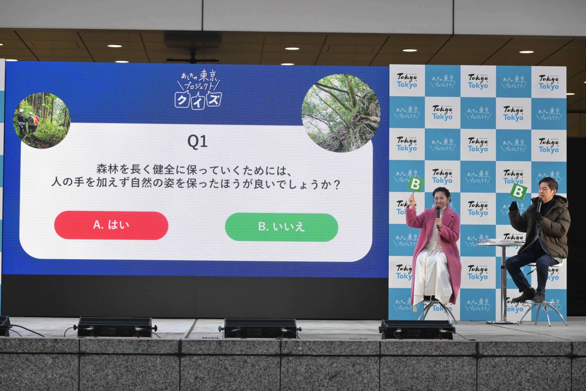 第1問は、「多摩フォレストツーリズムでは東京の森にフィーチャーしました。そんな森林を長く健全に保っていくためには、人の手を加えず自然の姿を保った方が良いでしょうか?」というクイズ。お二人は「いいえ」を選択し、見事正解となりました。