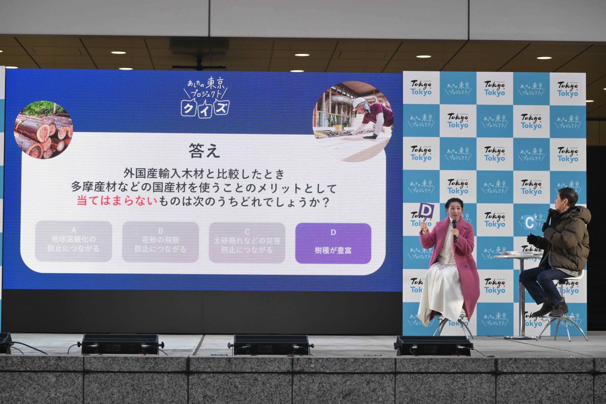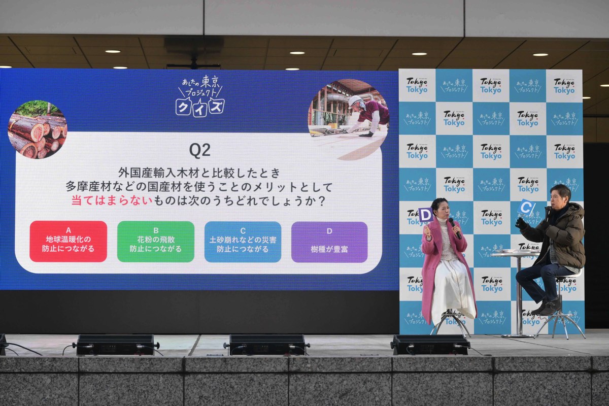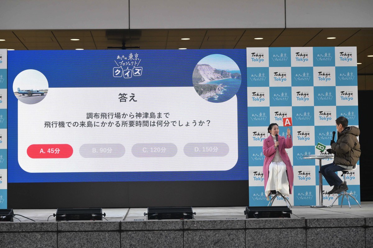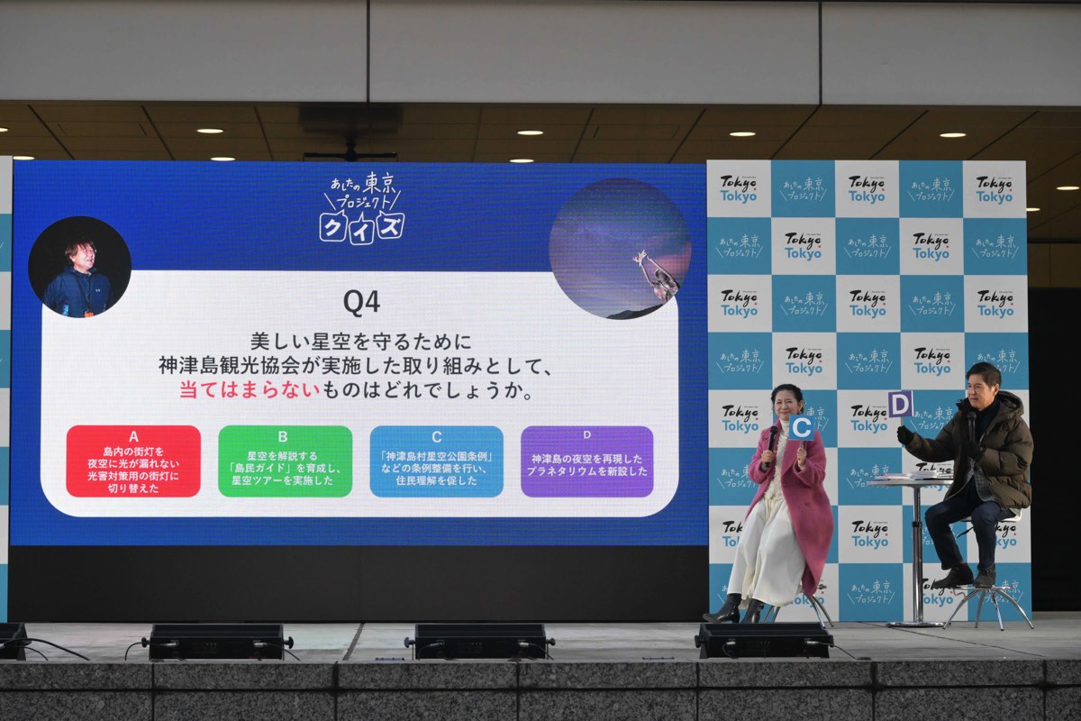 トークショーが終わると、プロジェクトに関するクイズコーナーが始まりました。これまでイベントを行ってきた、東京の多摩・島しょ地域に関するクイズに、ゲストの二人が挑戦。来場者も一緒に楽しめる、参加型の企画です。