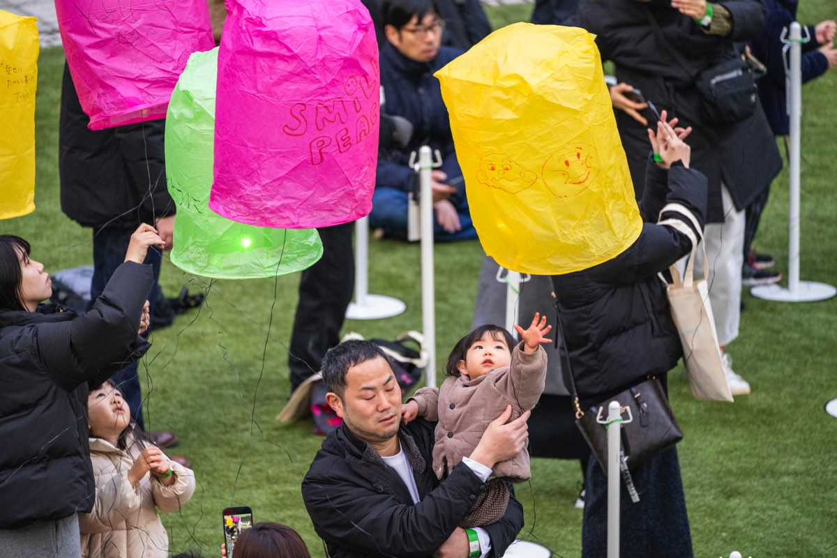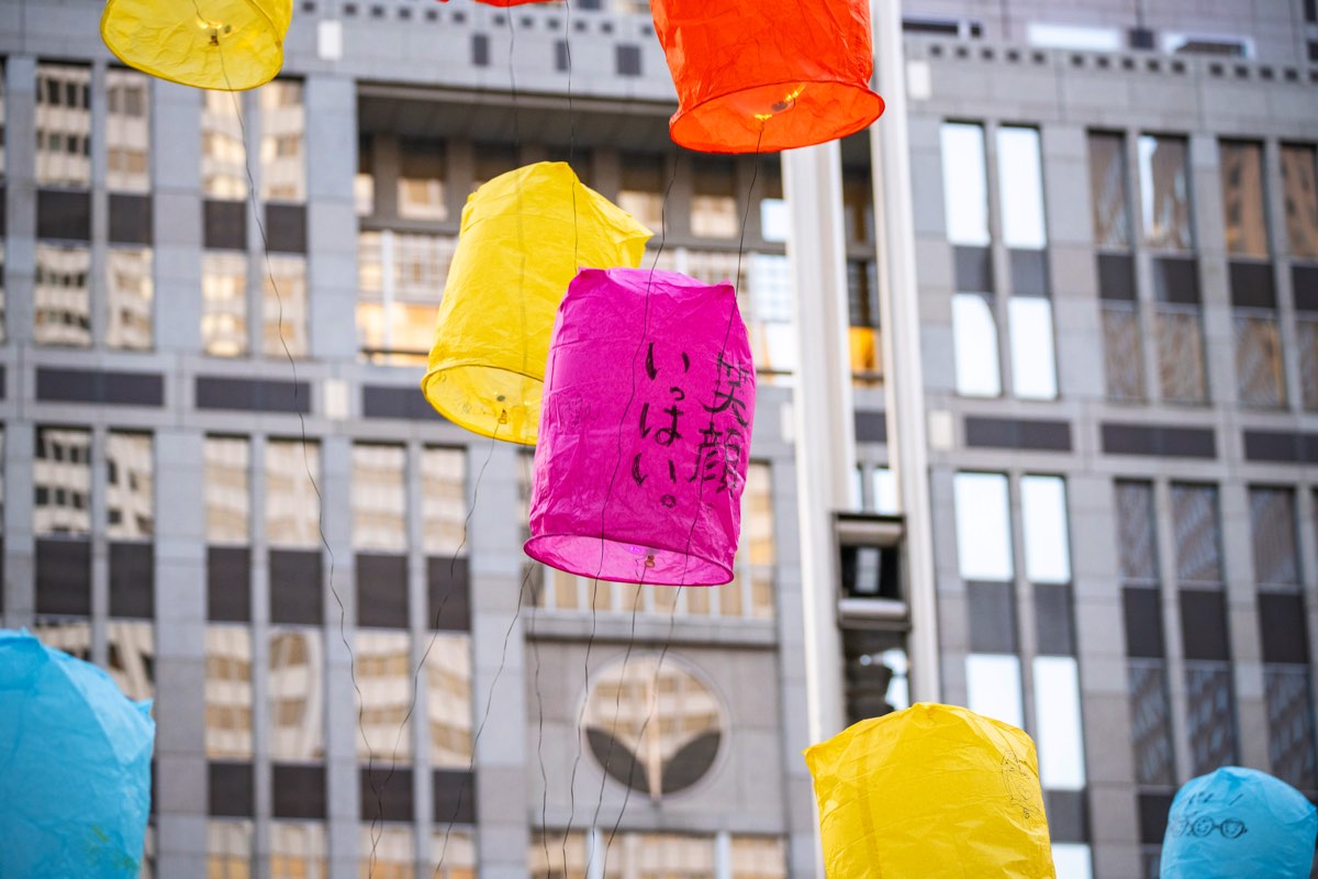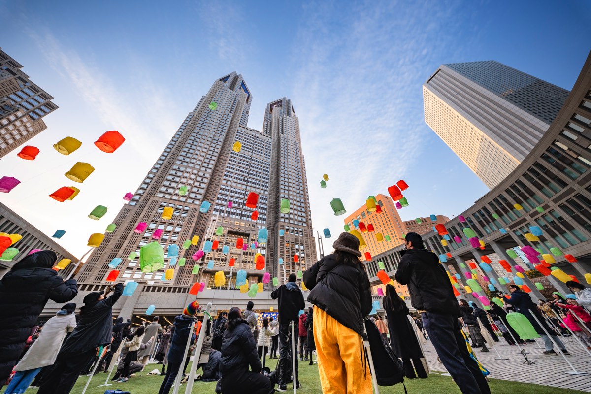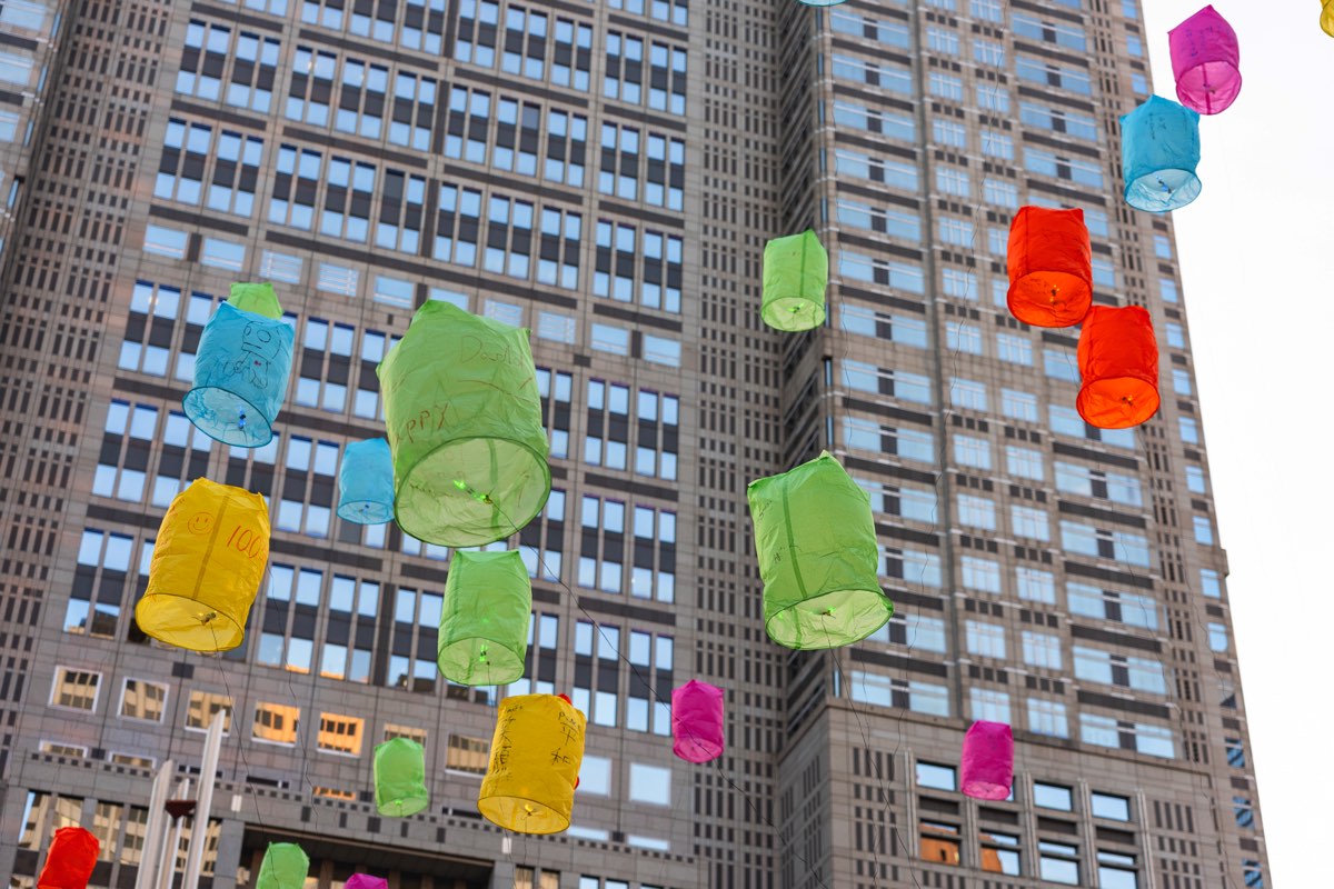 ブルー、グリーン、ピンク、イエロー、オレンジと、色とりどりに輝き、新宿の空を照らすたくさんのランタン。都民広場の空に、光がゆらゆらと舞う美しい光景が広がり、会場には歓声と拍手が響きます。さらにスクリーンには、キャンペーンで集まったデジタルランタンが投影。たくさんの人々の思いが集まり、都民広場を埋め尽くしました。一日限りの特別な“新しい景色”は、多くの人の胸に刻まれたはずです。