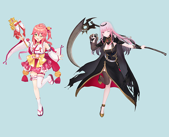 ▶ Sakura Miko (left)Used to work hard in the Virtual Sakura Shrine accomplishing duties as a shrine maiden until, following the gods' orders, she was led to Japan where she found out about Tokino Sora. After developing huge admiration for her, she decided to become a virtual shrine maiden idol and continue to keep working hard for that dream! ▶ Mori Calliope (right) The Grim Reaper's first apprentice. Calliope decided to become a VTuber to harvest souls. That being said, despite the image her hardcore vocals and manner of speech gives off, she's actually a gentle-hearted girl who cares greatly for her friends. *hololive production is a VTuber agency that consists of talent groups such as hololive and HOLOSTARS that focus on live streaming and content creation on platforms such as YouTube.