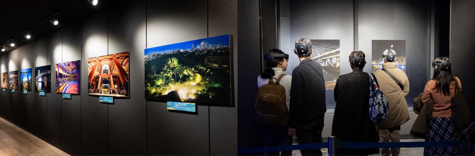 本イベントでは、トークショーの他にも東京の夜景にちなんだ展示も行われました。入口から伸びる通路には東京の夜景に関するパネルが展示。MR(Mixed Reality、複合現実)体験コーナーでは、夜景の写真と同じ場所で描かれた浮世絵が浮かび上がり、多くの参加者が過去と現在の比較を楽しみました。